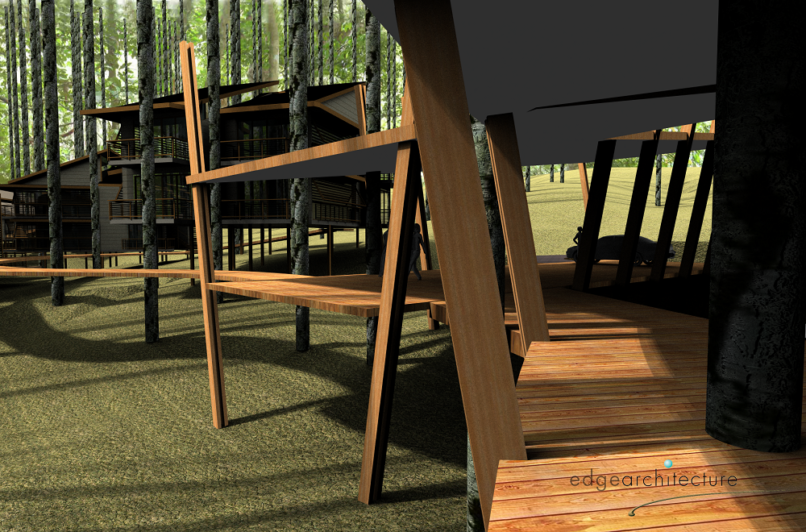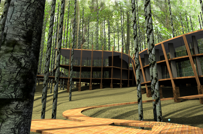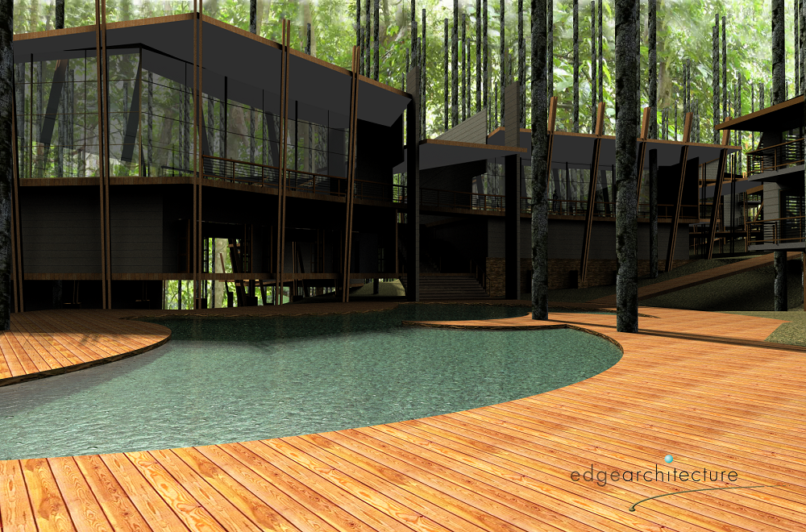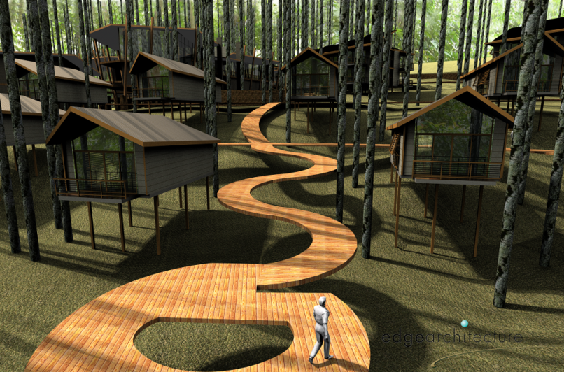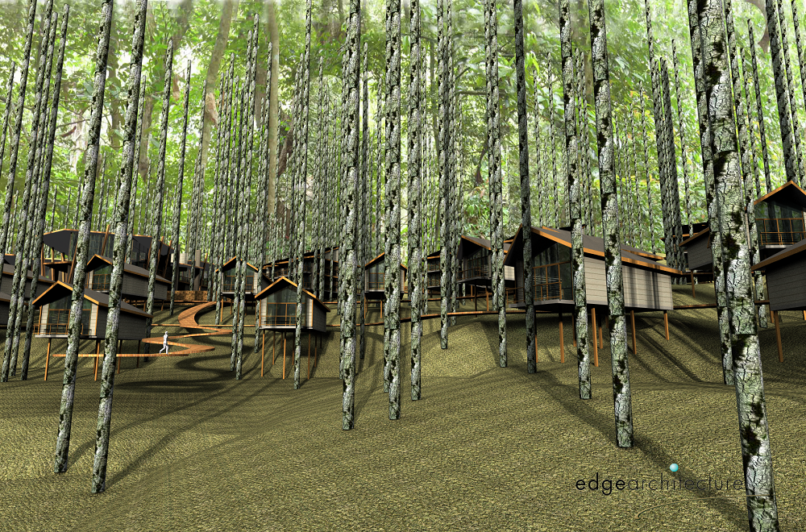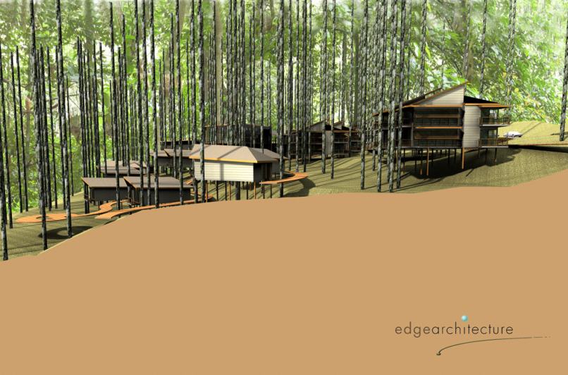 This tourist resort concept provides flexibility in designing and siting buildings with sensitivity to the sloping land forms and rainforest ecology. The site, in close proximity to Cairns, exhibits a portion of rainforest environment adjacent to world heritage parkland. These criteria invoked a minimal footprint and respect for existing ecology, stormwater and vegetation. Boardwalk access throughout the site suspends guests above the forest floor for passive observation of the surrounds.